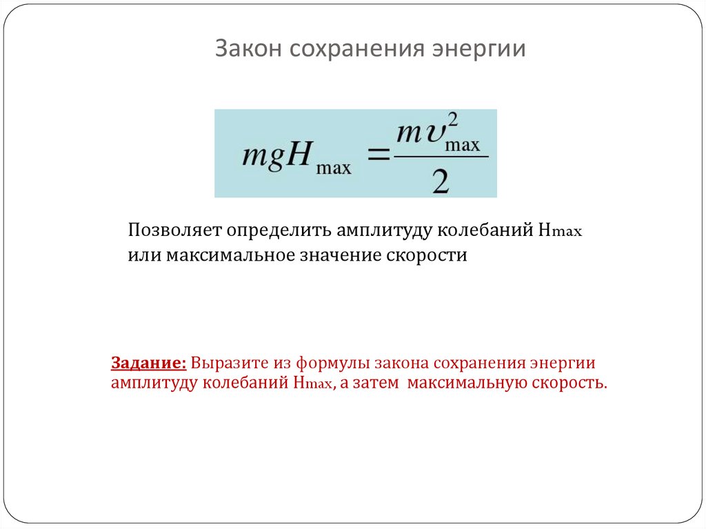 Закон сохранения энергииПозволяет определить амплитуду колебаний Нmax