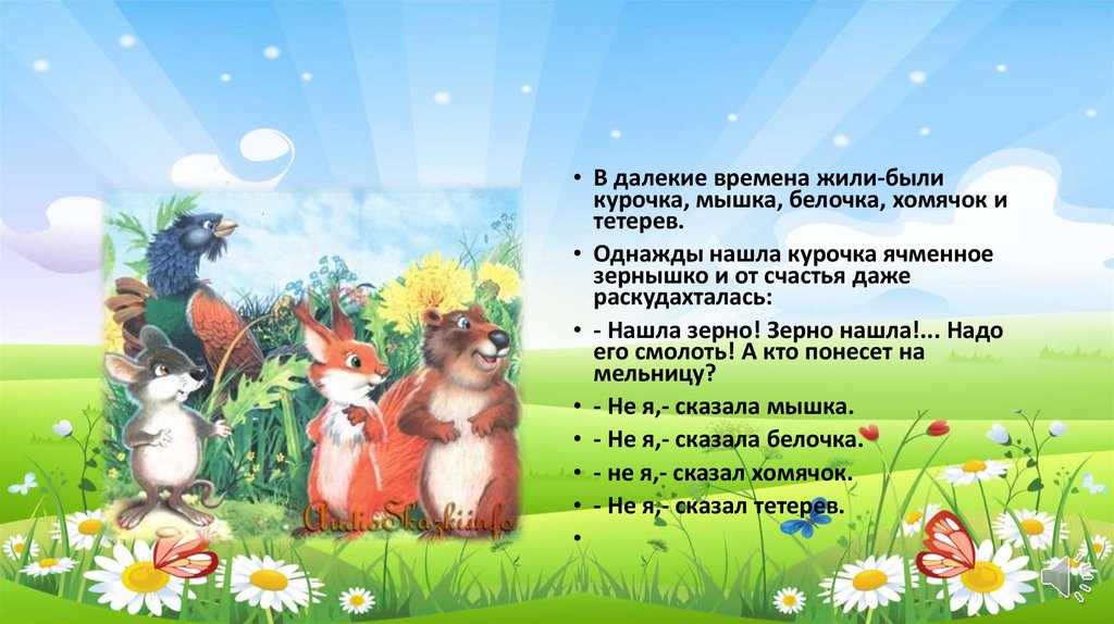• В далекие времена жили-быликурочка, мышка, белочка, хомячок и