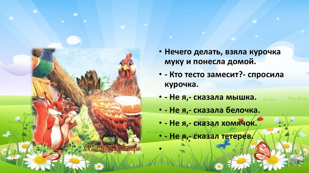 • Замесила курочка тесто, ипечку затопила, и хлеб сама