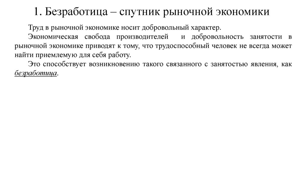 1. Безработица – спутник рыночной экономикиТруд в рыночной экономике носит добровольный характер.