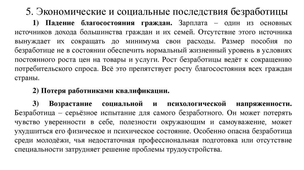 5. Экономические и социальные последствия безработицы1) Падение благосостояния граждан. Зарплата – один из основных
