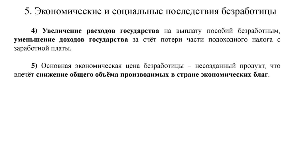 5. Экономические и социальные последствия безработицы4) Увеличение расходов государства на выплату пособий безработным,