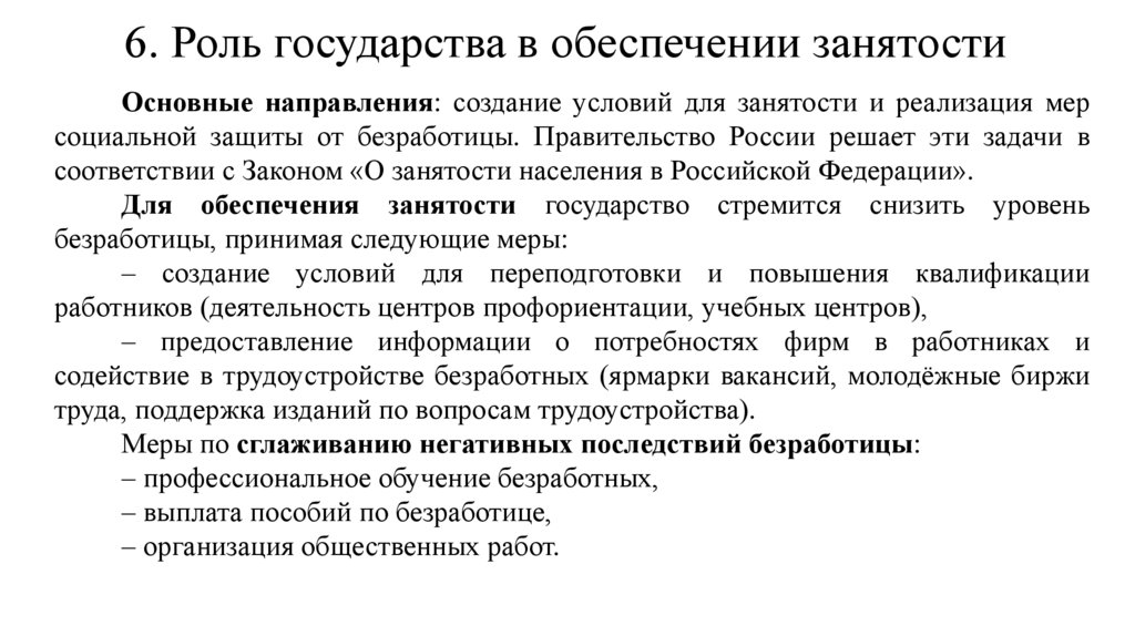 6. Роль государства в обеспечении занятостиОсновные направления: создание условий для занятости и реализация мер