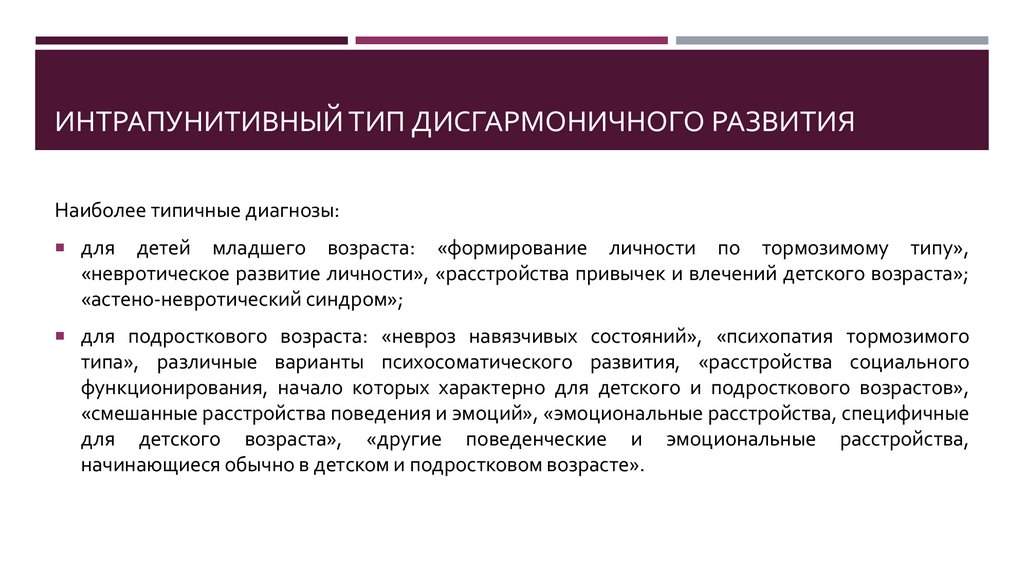 ИНТРАПУНИТИВНЫЙ ТИП ДИСГАРМОНИЧНОГО РАЗВИТИЯНаиболее типичные диагнозы: