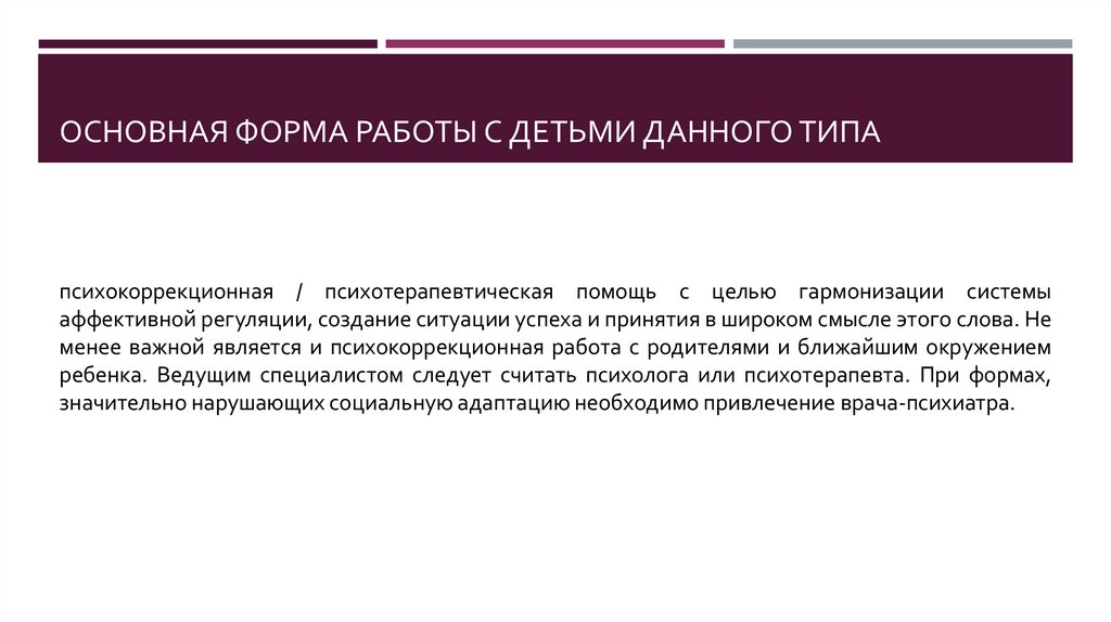 ОСНОВНАЯ ФОРМА РАБОТЫ С ДЕТЬМИ ДАННОГО ТИПАпсихокоррекционная / психотерапевтическая помощь с целью гармонизации системы