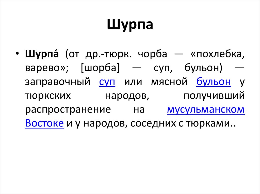 Шурпа• Шурпа́ (от др.-тюрк. чорба — «похлебка,