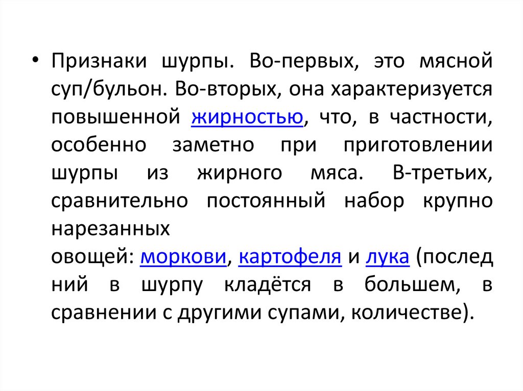 • Признаки шурпы. Во-первых, это мяснойсуп/бульон. Во-вторых, она характеризуется