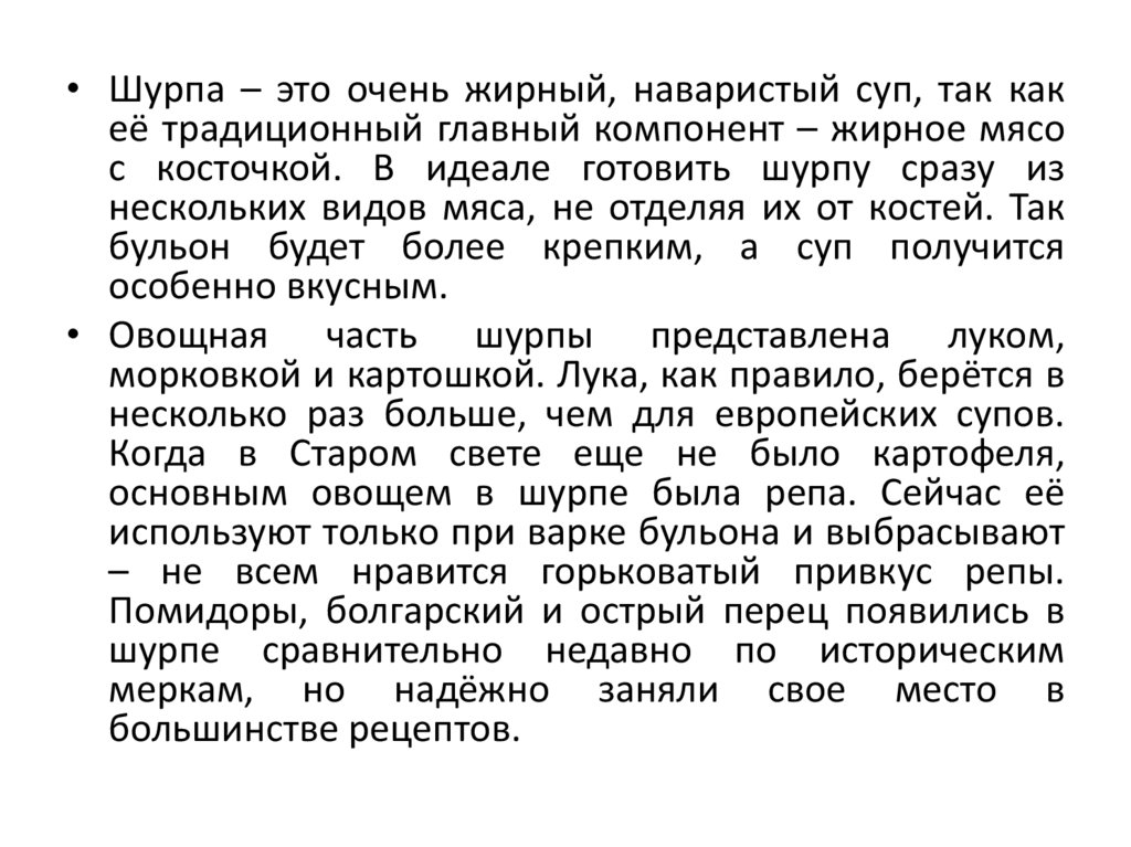 • Шурпа – это очень жирный, наваристый суп, так какеё традиционный главный компонент – жирное мясо