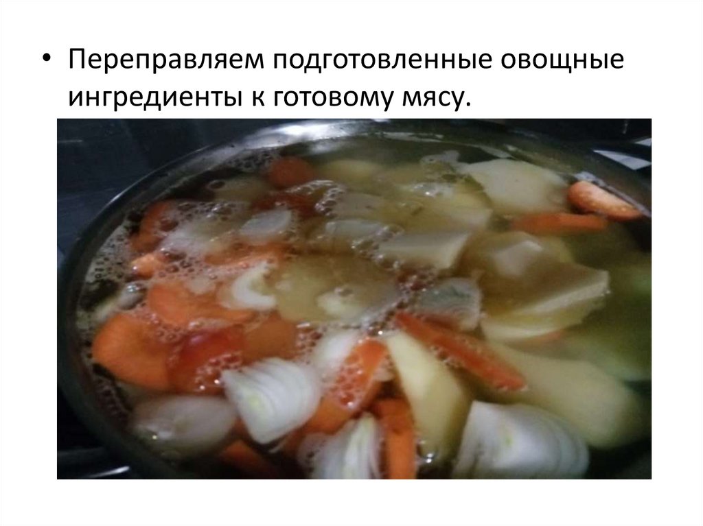 • Переправляем подготовленные овощныеингредиенты к готовому мясу.
