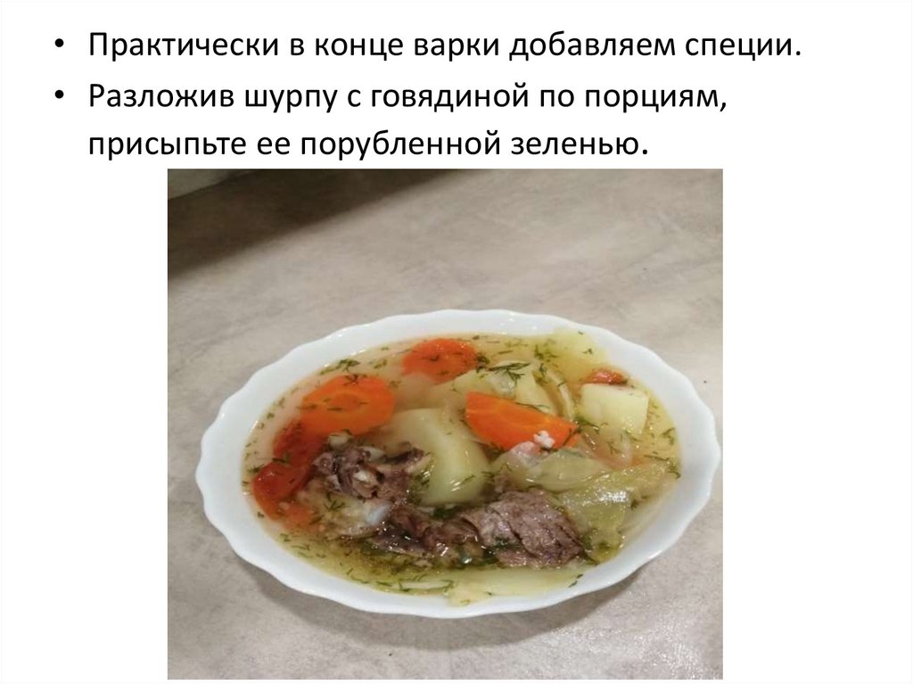• Практически в конце варки добавляем специи.• Разложив шурпу с говядиной по порциям,
