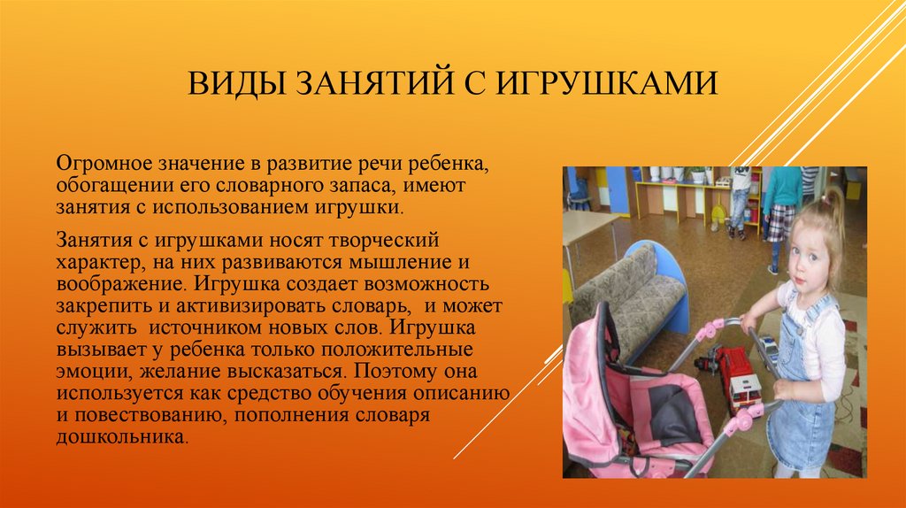 ВИДЫ ЗАНЯТИЙ С ИГРУШКАМИОгромное значение в развитие речи ребенка,