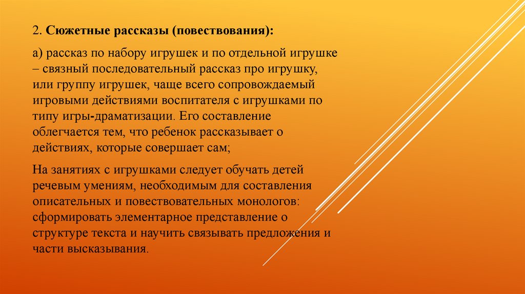 2. Сюжетные рассказы (повествования):а) рассказ по набору игрушек и по отдельной игрушке