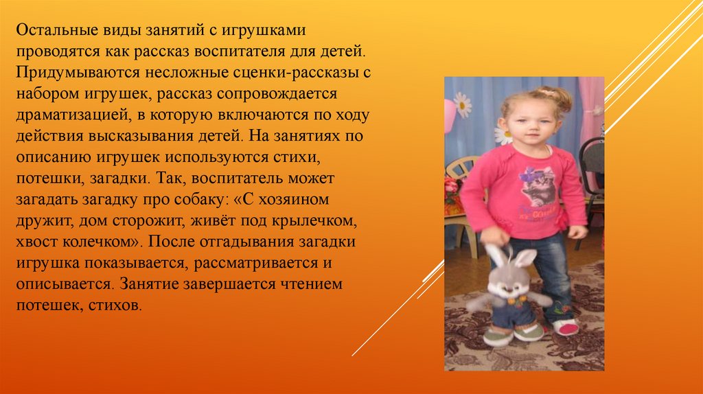 Остальные виды занятий с игрушкамипроводятся как рассказ воспитателя для детей.