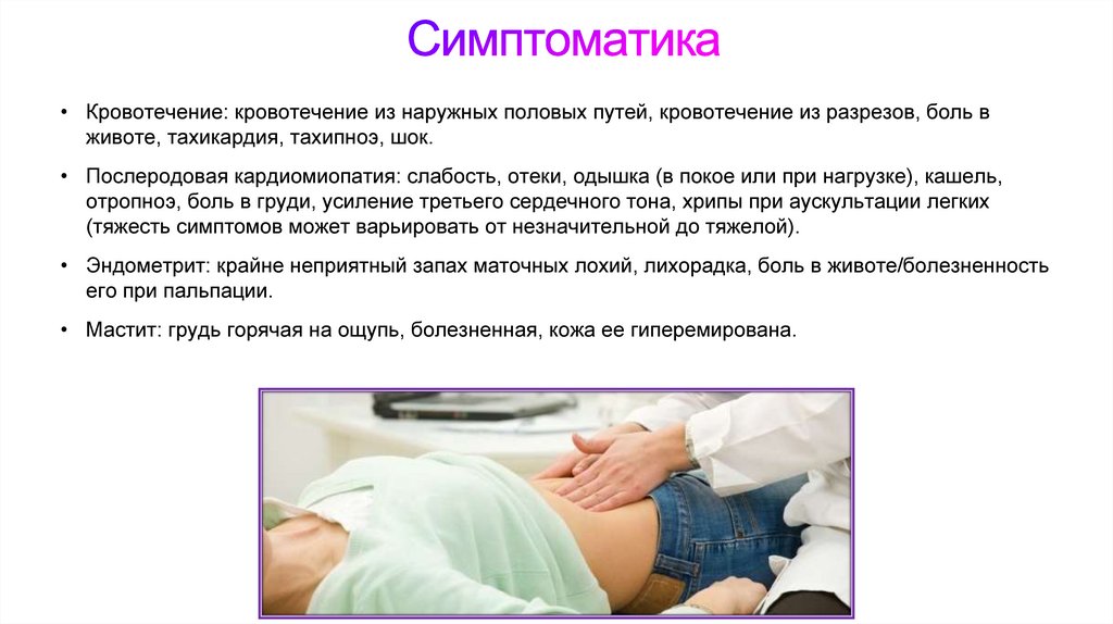 • Кровотечение: кровотечение из наружных половых путей, кровотечение из разрезов, боль вживоте, тахикардия, тахипноэ, шок.