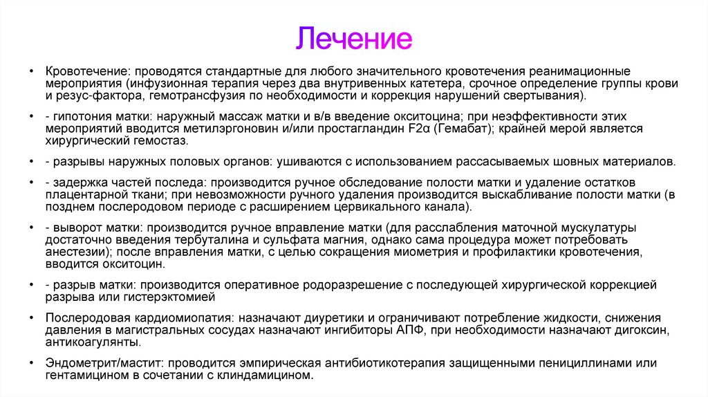 • - гипотония матки: наружный массаж матки и в/в введение окситоцина; при неэффективности этих