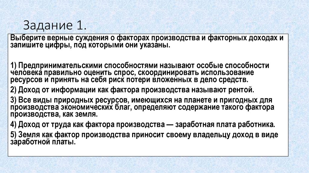 Задание 1.Выберите верные суждения о факторах производства и факторных доходах и