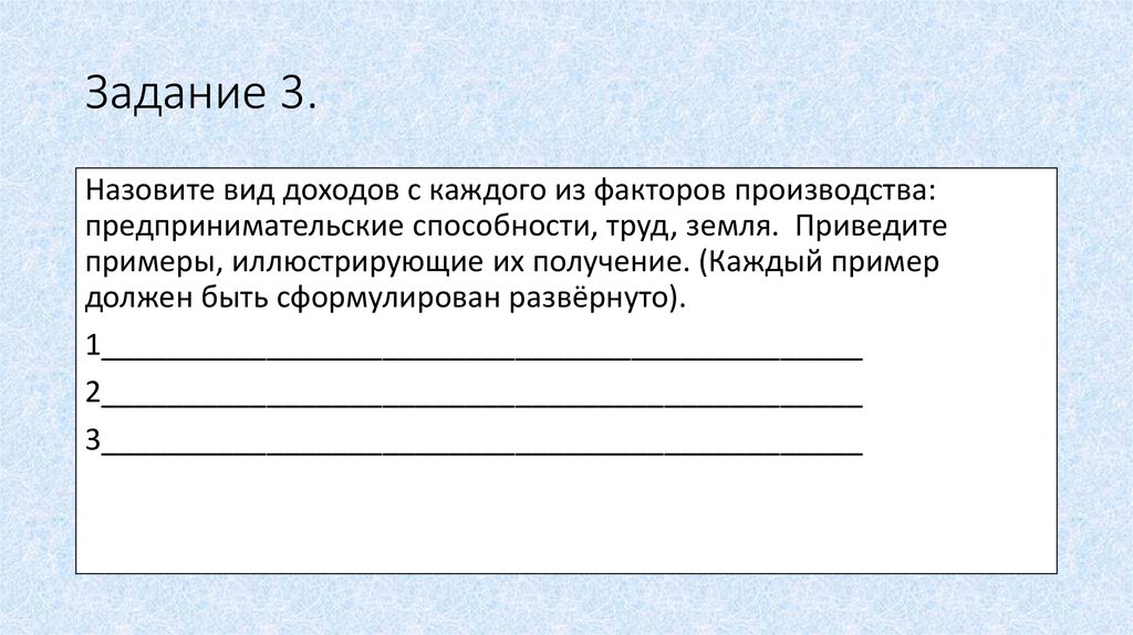 Задание 3.Назовите вид доходов с каждого из факторов производства:
