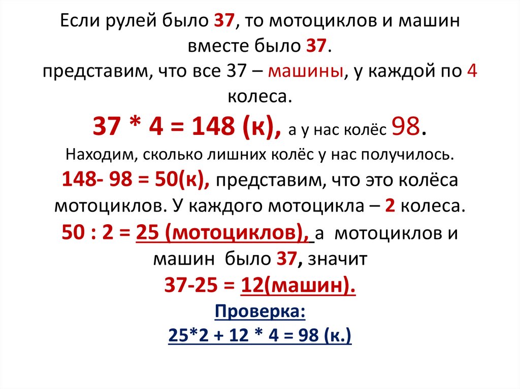 Если рулей было 37, то мотоциклов и машинвместе было 37.