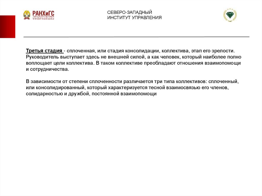 Третья стадия - сплоченная, или стадия консолидации, коллектива, этап его зрелости.