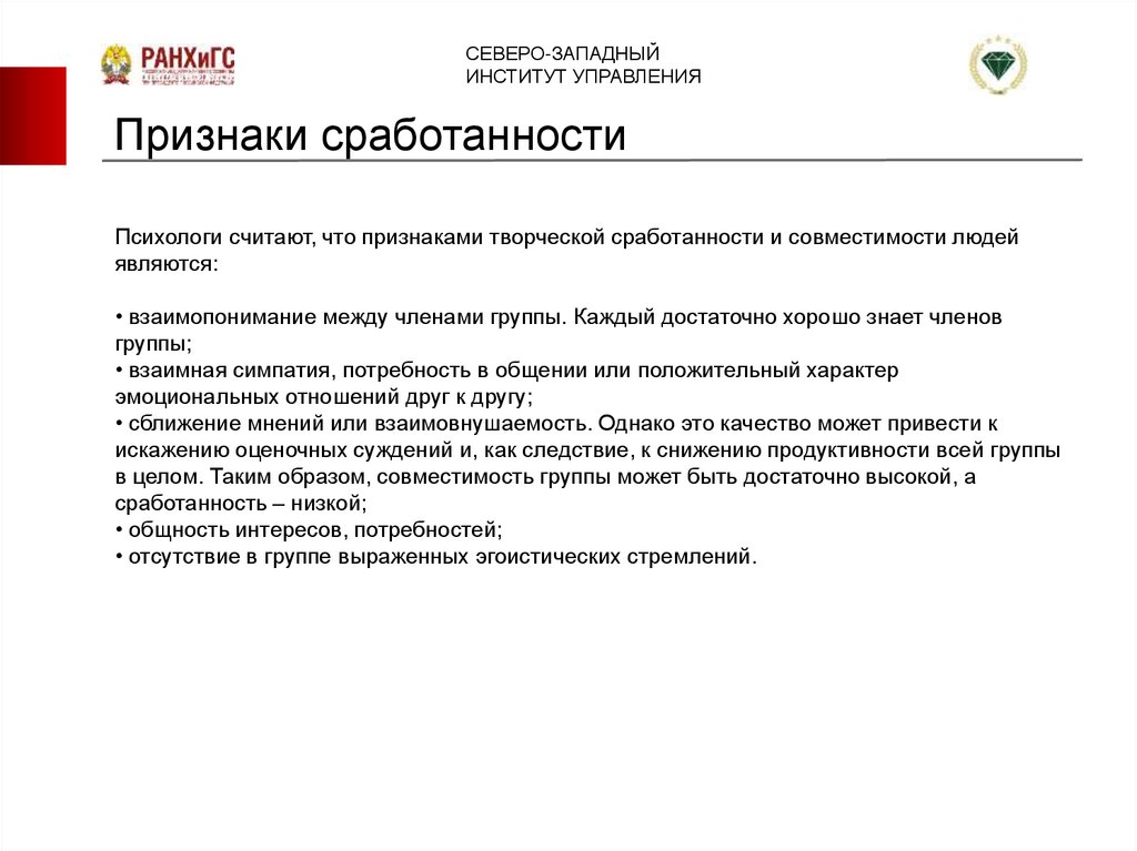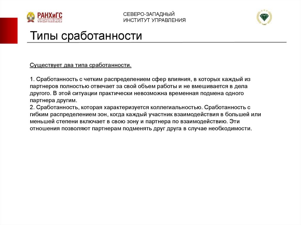 2. Сработанность, которая характеризуется коллегиальностью. Сработанность с