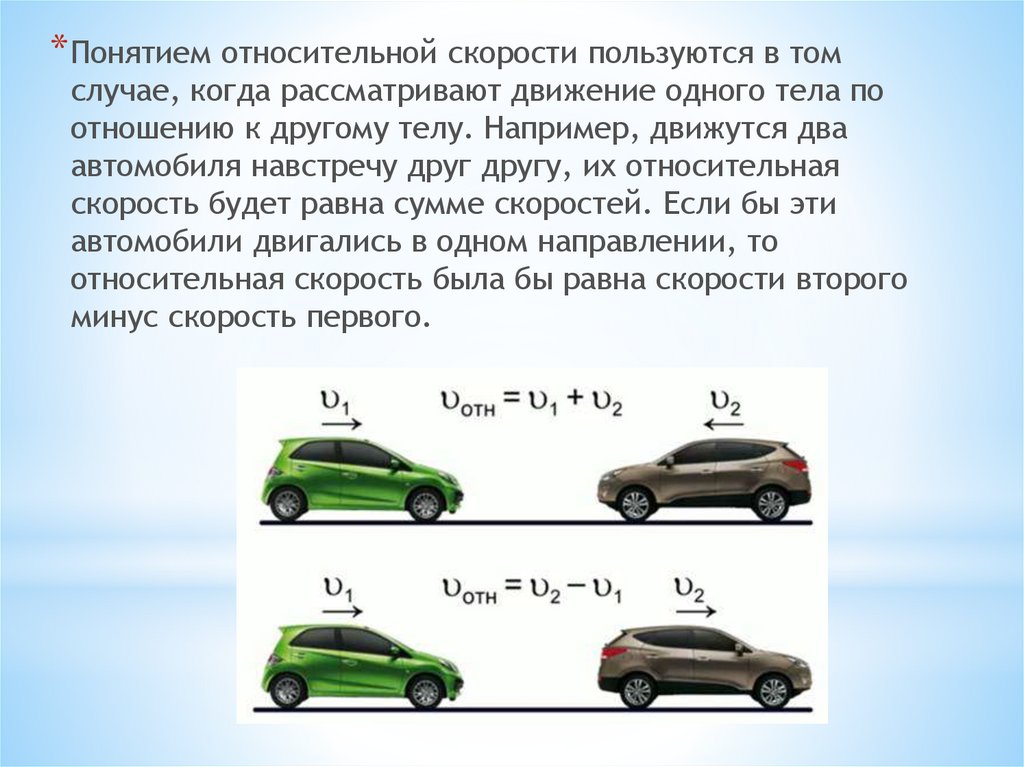 * Понятием относительной скорости пользуются в томслучае, когда рассматривают движение одного тела по