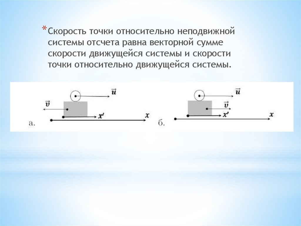 * Скорость точки относительно неподвижнойсистемы отсчета равна векторной сумме