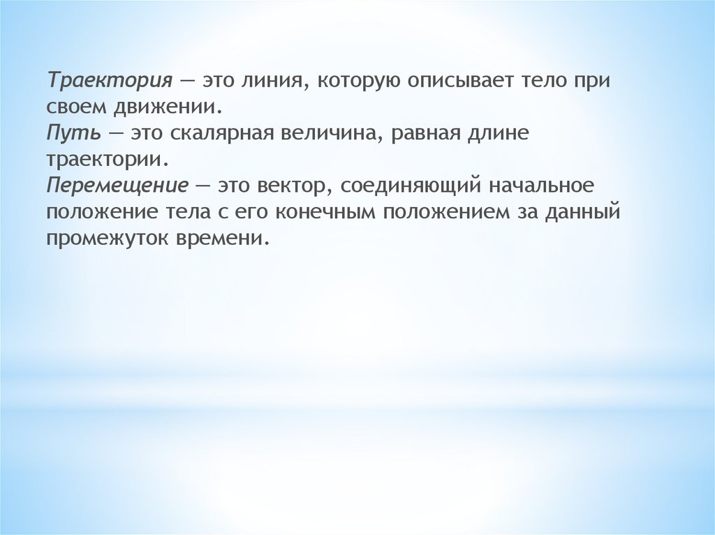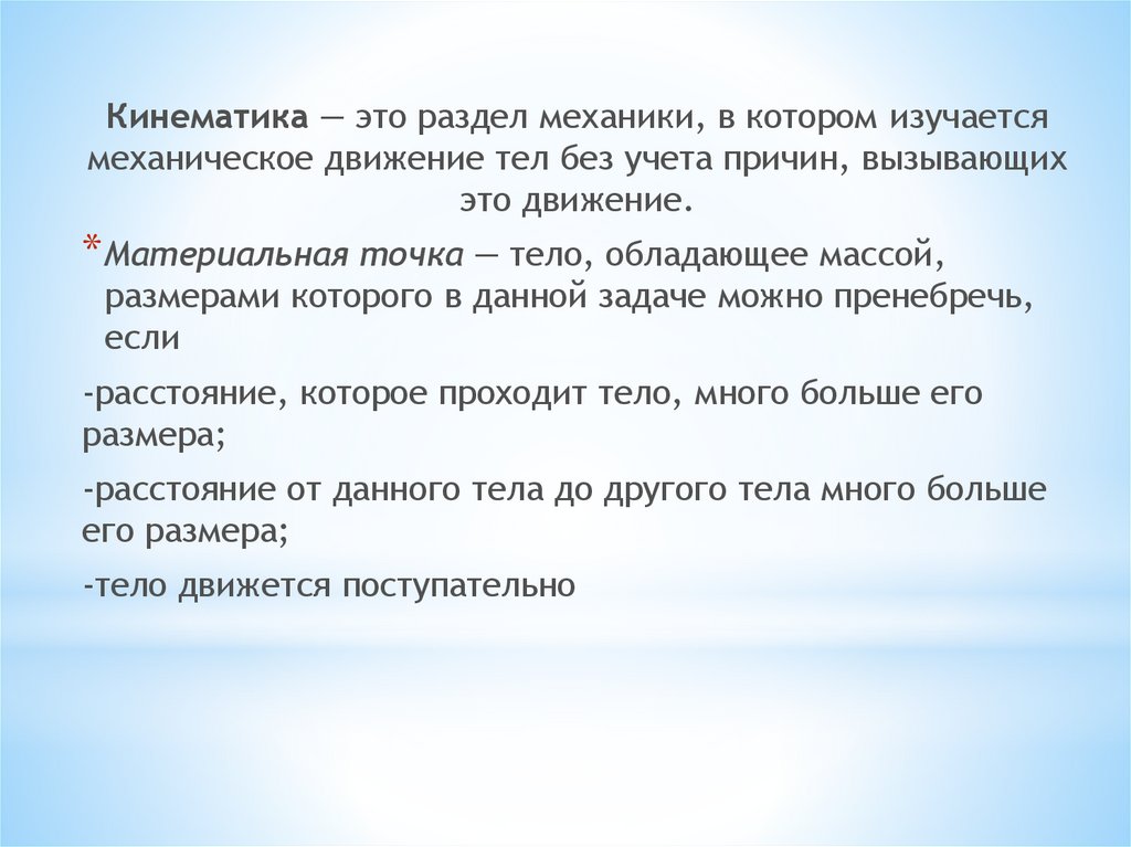 Кинематика — это раздел механики, в котором изучаетсямеханическое движение тел без учета причин, вызывающих