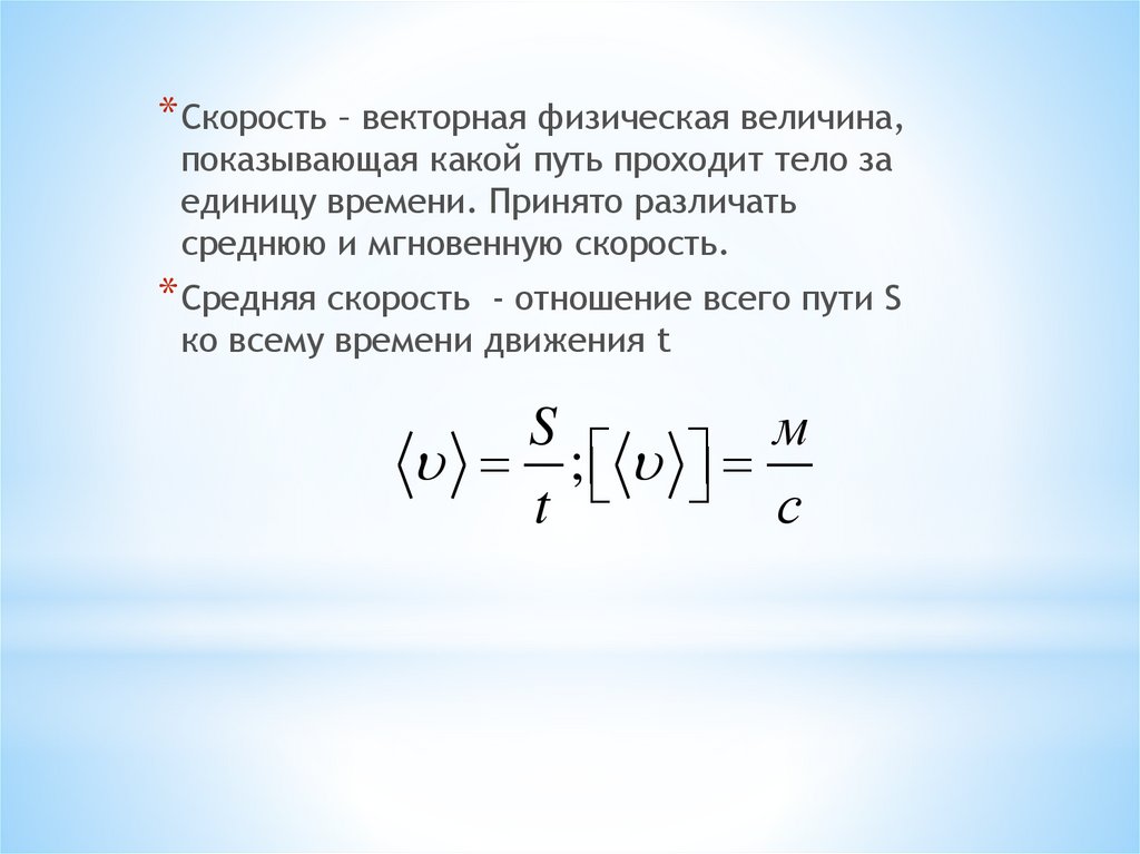 * Скорость – векторная физическая величина,показывающая какой путь проходит тело за