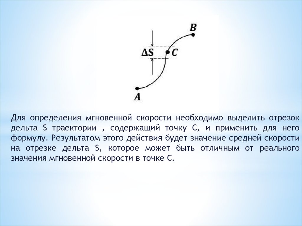 Для определения мгновенной скорости необходимо выделить отрезокдельта S траектории , содержащий точку С, и применить для него