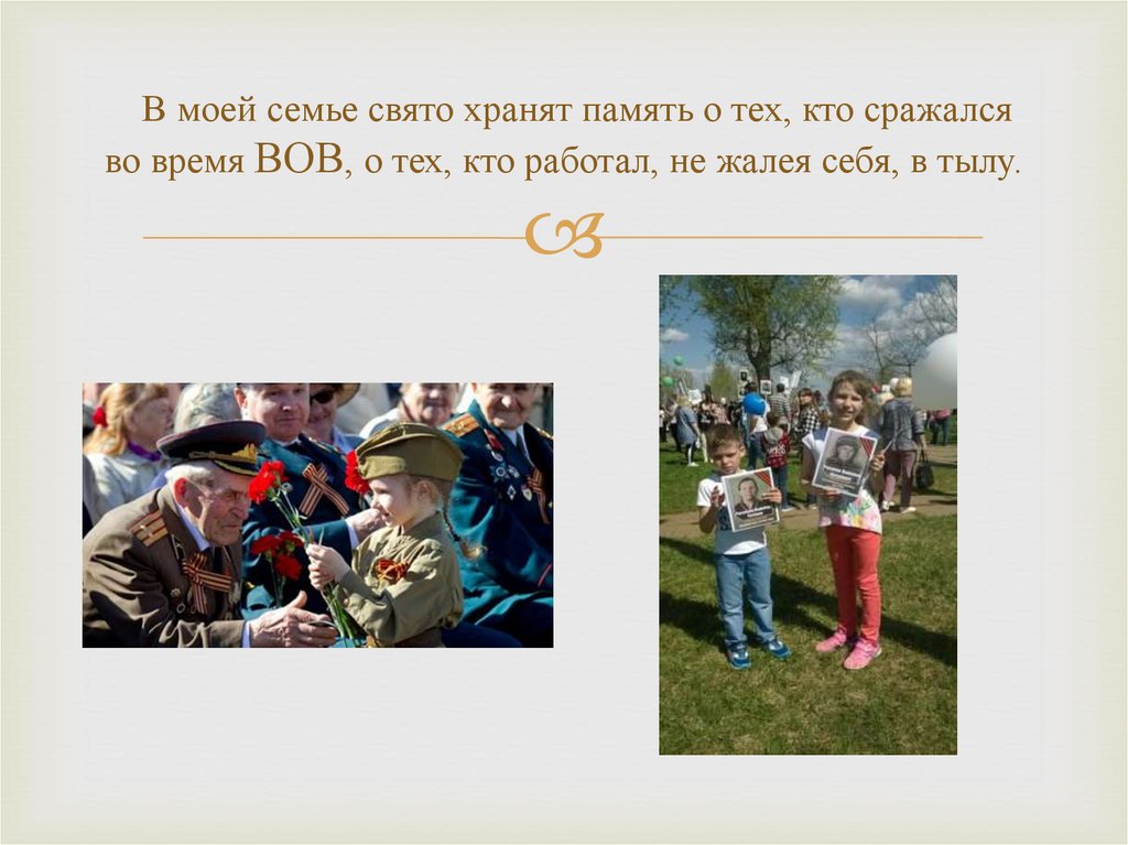 В моей семье свято хранят память о тех, кто сражалсяво время ВОВ, о тех, кто работал, не жалея себя, в тылу.