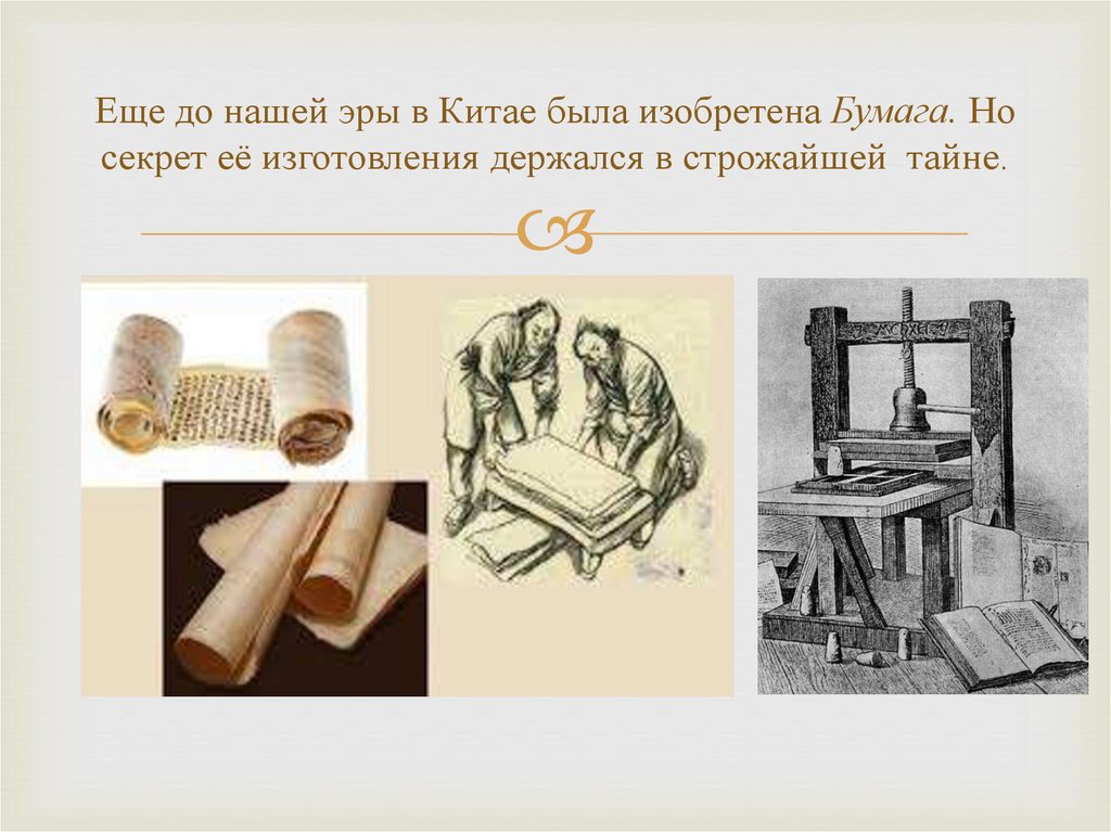 Еще до нашей эры в Китае была изобретена Бумага. Носекрет её изготовления держался в строжайшей тайне.