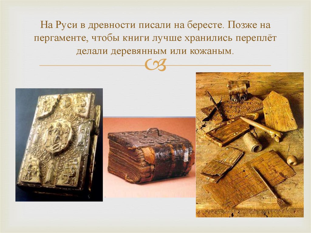 На Руси в древности писали на бересте. Позже напергаменте, чтобы книги лучше хранились переплёт