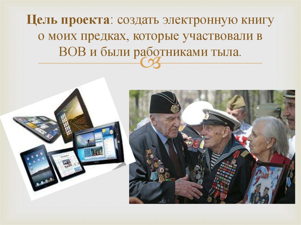 Цель проекта: создать электронную книгуо моих предках, которые участвовали в