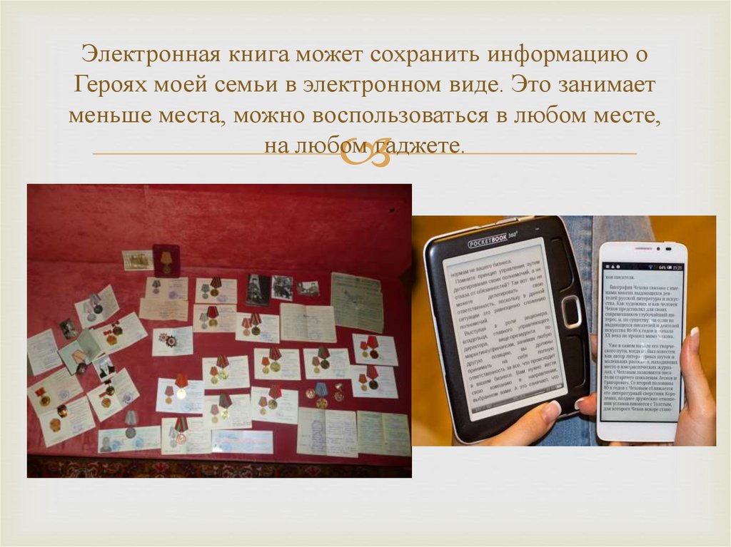 Электронная книга может сохранить информацию оГероях моей семьи в электронном виде. Это занимает