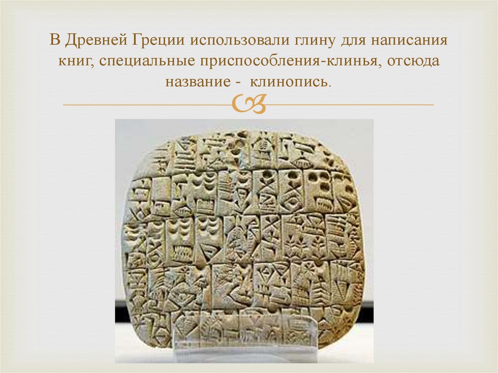 В Древней Греции использовали глину для написаниякниг, специальные приспособления-клинья, отсюда