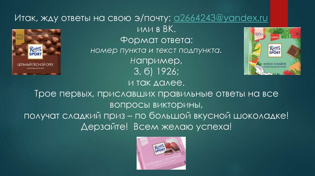 Итак, жду ответы на свою э/почту: a2664243@yandex.ruили в ВК.