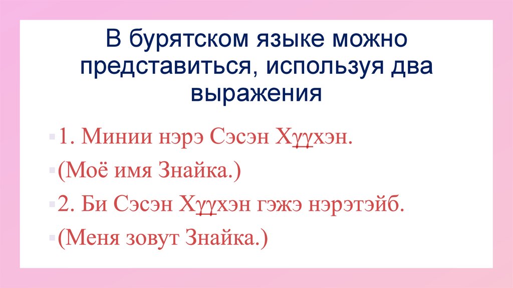 В бурятском языке можнопредставиться, используя два