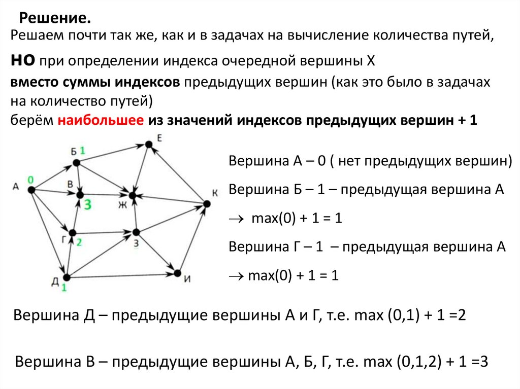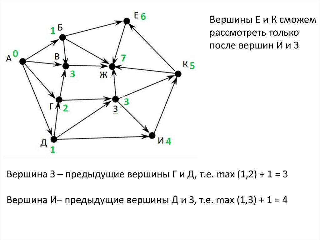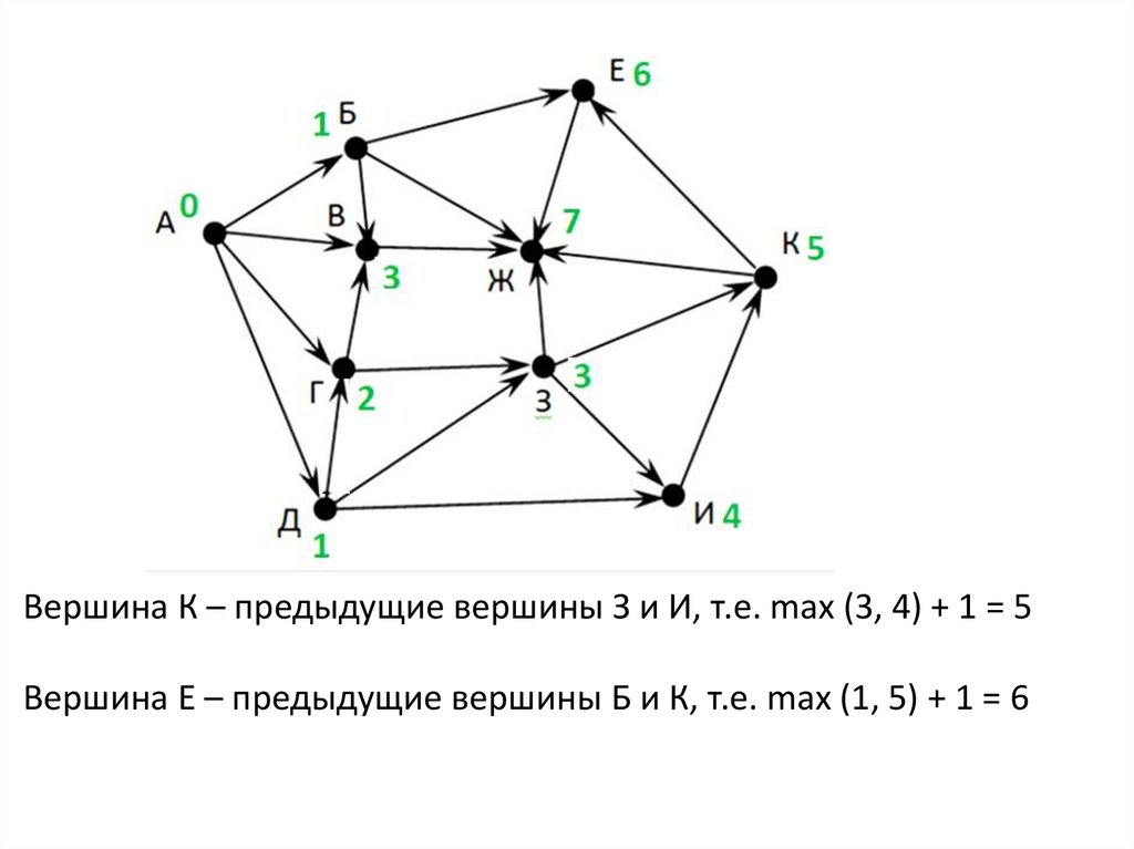 Вершина К – предыдущие вершины З и И, т.е. max (3, 4) + 1 = 5Вершина Е – предыдущие вершины Б и К, т.е. max (1, 5) + 1 = 6
