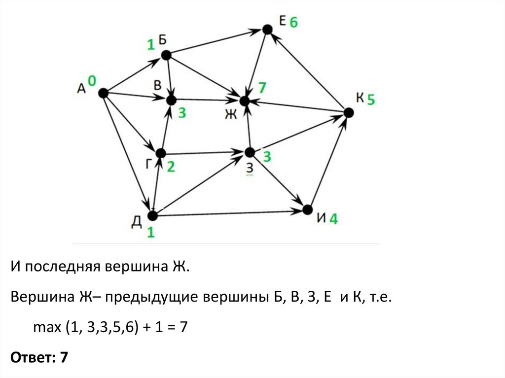 И последняя вершина Ж.Вершина Ж– предыдущие вершины Б, В, З, Е и К, т.е.