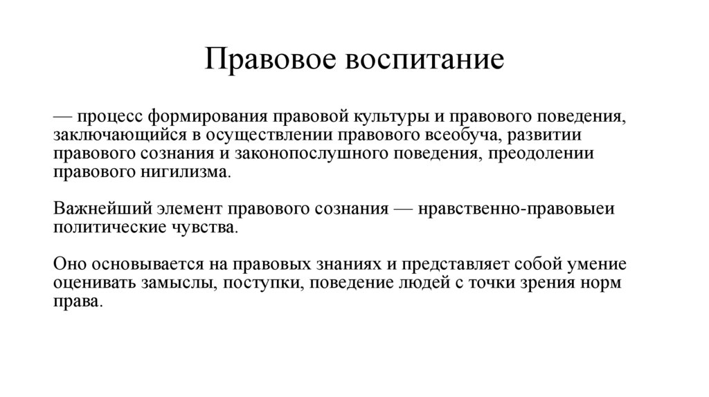 Правовое воспитание— процесс формирования правовой культуры и правового поведения,