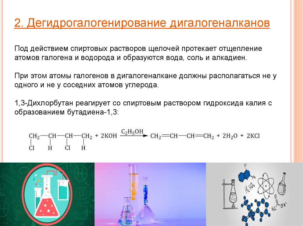 2. Дегидрогалогенирование дигалогеналкановПод действием спиртовых растворов щелочей протекает отщепление