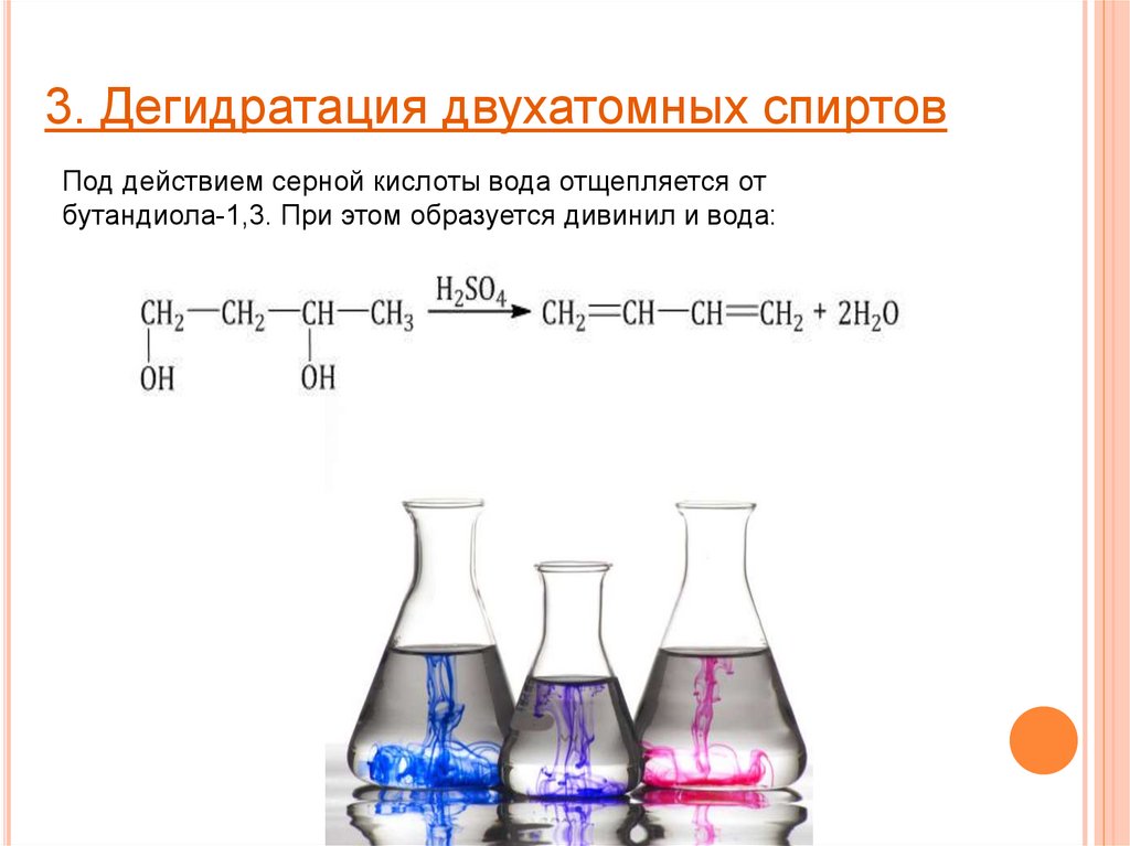 3. Дегидратация двухатомных спиртовПод действием серной кислоты вода отщепляется от