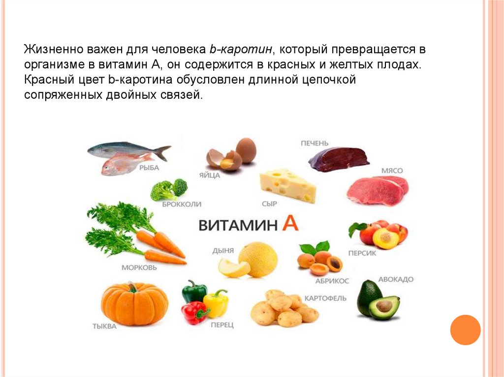 Жизненно важен для человека b-каротин, который превращается ворганизме в витамин А, он содержится в красных и желтых плодах.