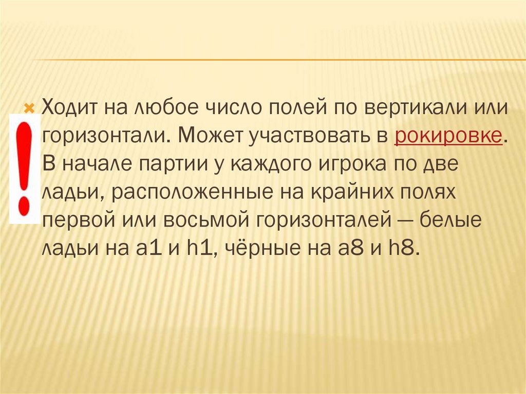 Ходит на любое число полей по вертикали илигоризонтали. Может участвовать в рокировке.