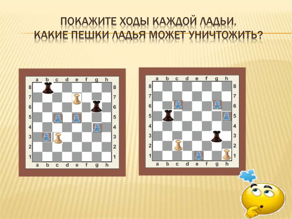 ПОКАЖИТЕ ХОДЫ КАЖДОЙ ЛАДЬИ.КАКИЕ ПЕШКИ ЛАДЬЯ МОЖЕТ УНИЧТОЖИТЬ?