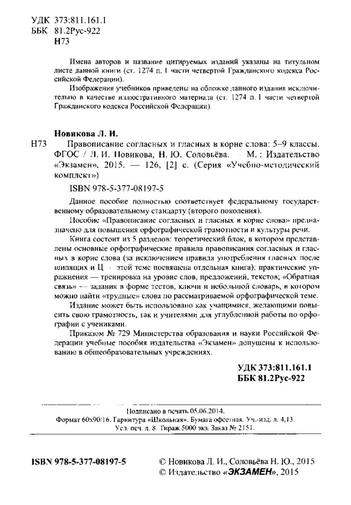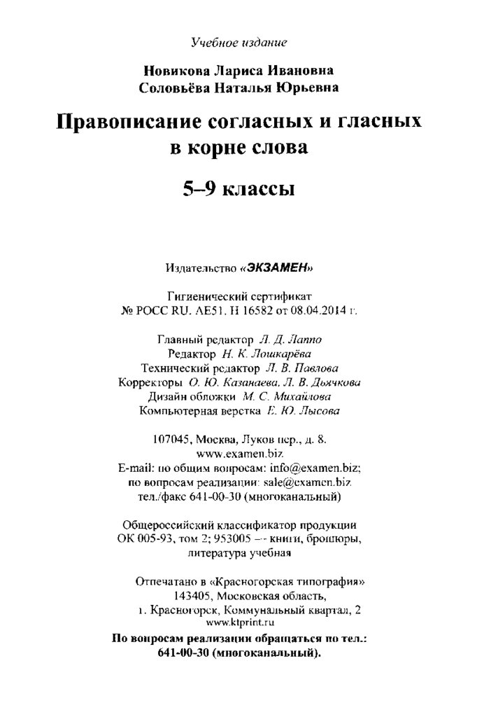Л. И. Новикова, Н. Ю. Соловьёва. Правописание согласных и гласных в корне слова. 5-9 классы