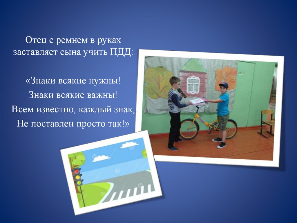 Отец с ремнем в рукахзаставляет сына учить ПДД: