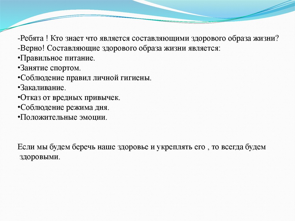-Ребята ! Кто знает что является составляющими здорового образа жизни?-Верно! Составляющие здорового образа жизни является: