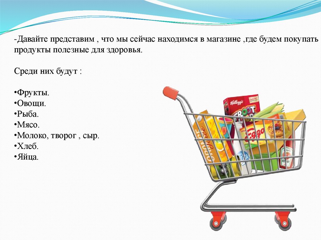 -Давайте представим , что мы сейчас находимся в магазине ,где будем покупатьпродукты полезные для здоровья.