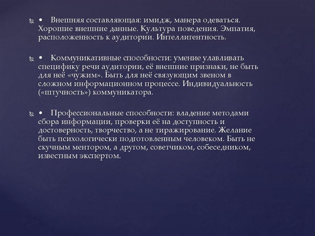 • Внешняя составляющая: имидж, манера одеваться.Хорошие внешние данные. Культура поведения. Эмпатия,